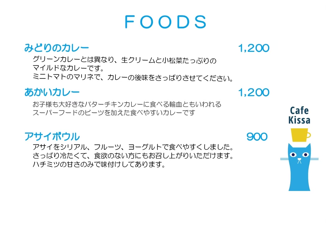 The menu at cafe kissa boasts an eclectic array of options that elegantly balances sweet and savory sensations. Indulge your sweet tooth with their プレーンシフォンケーキ (Plain Chiffon Cake), a light and fluffy dessert that strikes the perfect harmony between sweetness and texture. Priced at just JP¥400, it's an ideal choice for those looking to treat themselves without a hint of guilt, as no additives are used, making it a safe pleasure for even the youngest patrons.